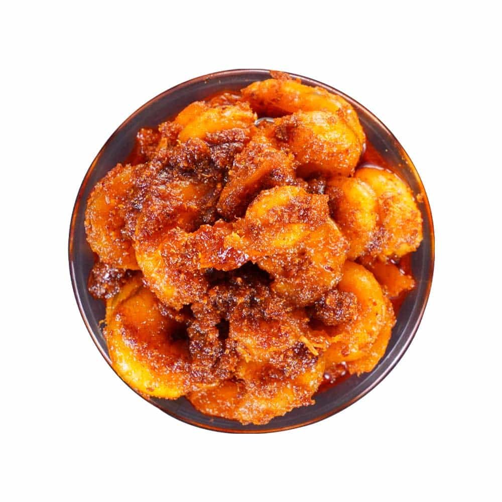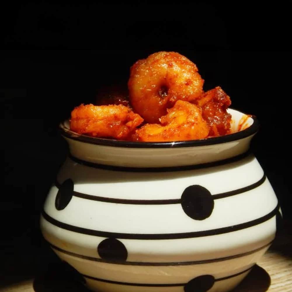 This journey starts with plump prawns, expertly marinated in a harmonious mixture of mustard oil, fiery red chili powder, earthy turmeric, and the distinctive pungency of mustard seeds. Freshly minced garlic and ginger add depth to the flavour, while tamarind pulp and salt ensure the perfect balance of tanginess and seasoning. Fragrant curry leaves and a hint of asafoetida (Hing) complete this culinary delight.