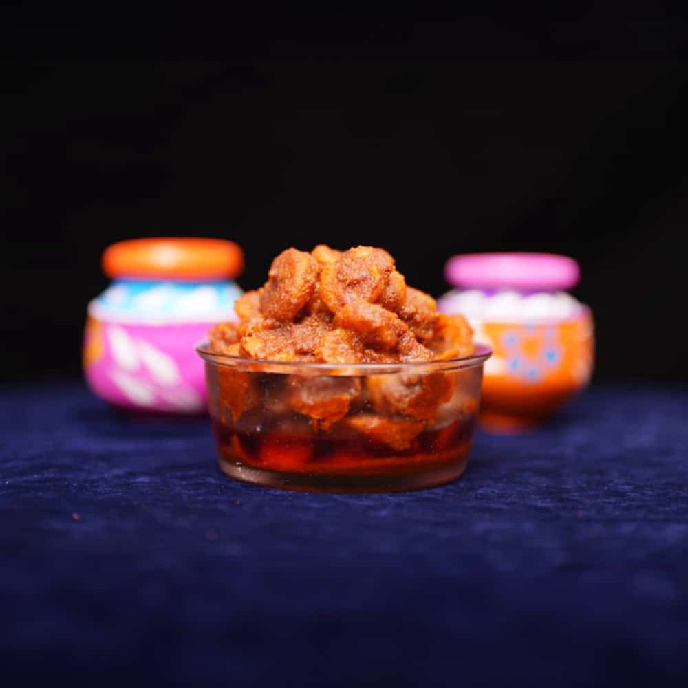 Experience the harmonious blend of ingredients that makes our Medium Prawns Pickle a culinary masterpiece. It begins with succulent prawns, meticulously marinated in a symphony of mustard oil, fiery red chili powder, earthy turmeric, and the unique pungency of mustard seeds. Freshly minced garlic and ginger contribute depth to the flavour profile, while tamarind pulp and salt guarantee the perfect balance of tanginess and seasoning. Fragrant curry leaves and a hint of asafoetida (Hing) round out this culinary creation.